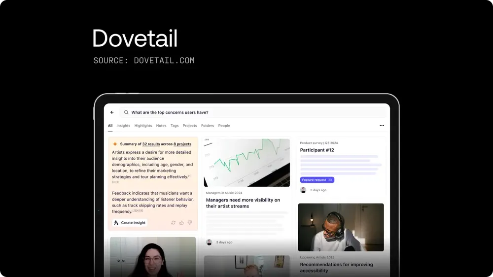Dovetail is a sophisticated tool suitable for managing user research and qualitative analysis. It centralizes a wide range of UX research data, including interview transcriptions, survey results, observation notes, usability test recordings, and more.