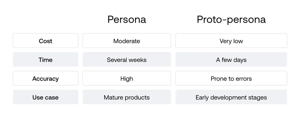 In contrast, for smaller products in the early stages of development, such as during ideation, using proto-personas can be a good choice. Proto-personas, built based on the team's assumptions and initial insights, are faster and more cost-effective to create than detailed personas. They allow specialists to progress quickly while experimenting with and refining concepts, without the extensive investment required for fully-fledged personas.