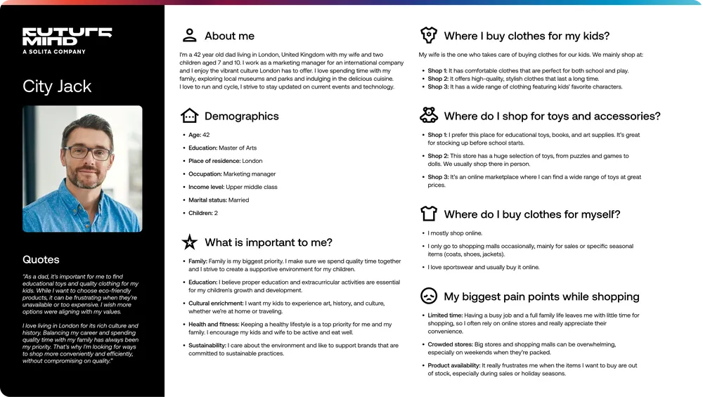 In our projects, we always tailor the personas to fit the specific industry and the needs of the project team. Regardless of the project, we combine quantitative data (e.g., average age, place of residence, frequently used apps) with qualitative data (e.g., interview quotes, identified pain points). This blend ensures that our personas are both detailed and accurate.