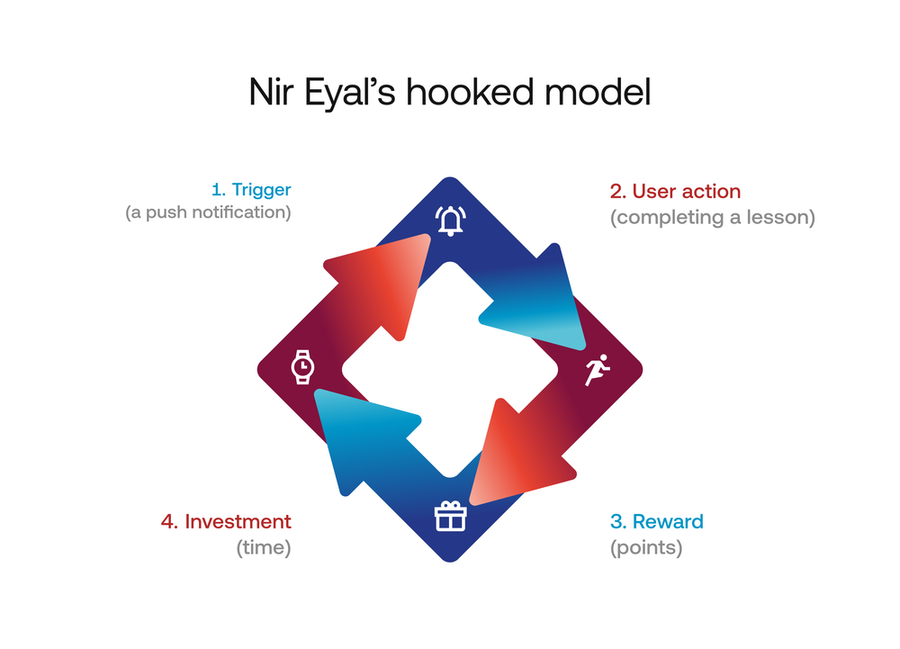 Duolingo is a prime example of the hooked model described by Nir Eyal: it starts with a trigger (a push notification). This leads to user action (completing a lesson), which is rewarded (with points). All of this is built around the key element of the model – investment (time).