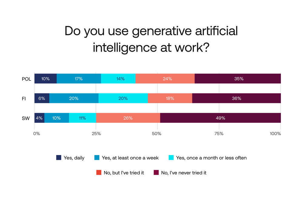 What's particularly striking is how Poland stands out in terms of engagement intensity. We have 10% of Polish professionals using GenAI daily – that's the highest regular usage rate among the three markets. Meanwhile, nearly half of Swedish respondents (49%) haven't even tried GenAI at work, which suggests much stronger cultural or organizational hesitancy.