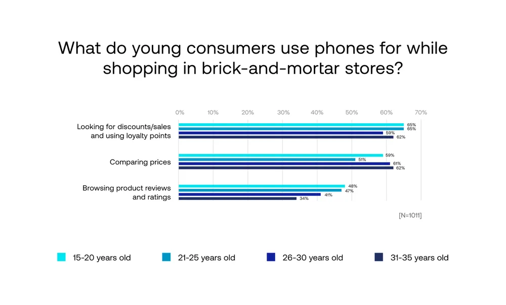 Participants of our report openly admit that smartphones are their go-to during shopping. They mainly use phones for snagging discounts, comparing products and prices, and reading reviews on specific items. It's evident that mobile devices have become indispensable shopping companions for this tech-savvy generation.