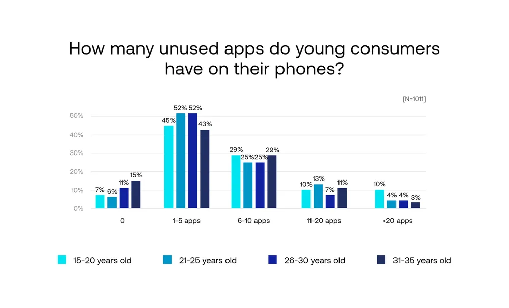 Our report shows that the youngest consumers accumulate a higher number of unused apps. They download these apps, use them once or twice when needed, and then simply forget about them.