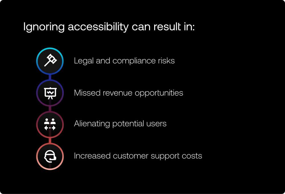 From legal liabilities and financial penalties to reputational damage and lost revenue, inaccessible design can lead to significant setbacks. But the cost isn’t just about avoiding risk – prioritizing accessibility is also a path to innovation, growth, and a broader, more loyal user base.